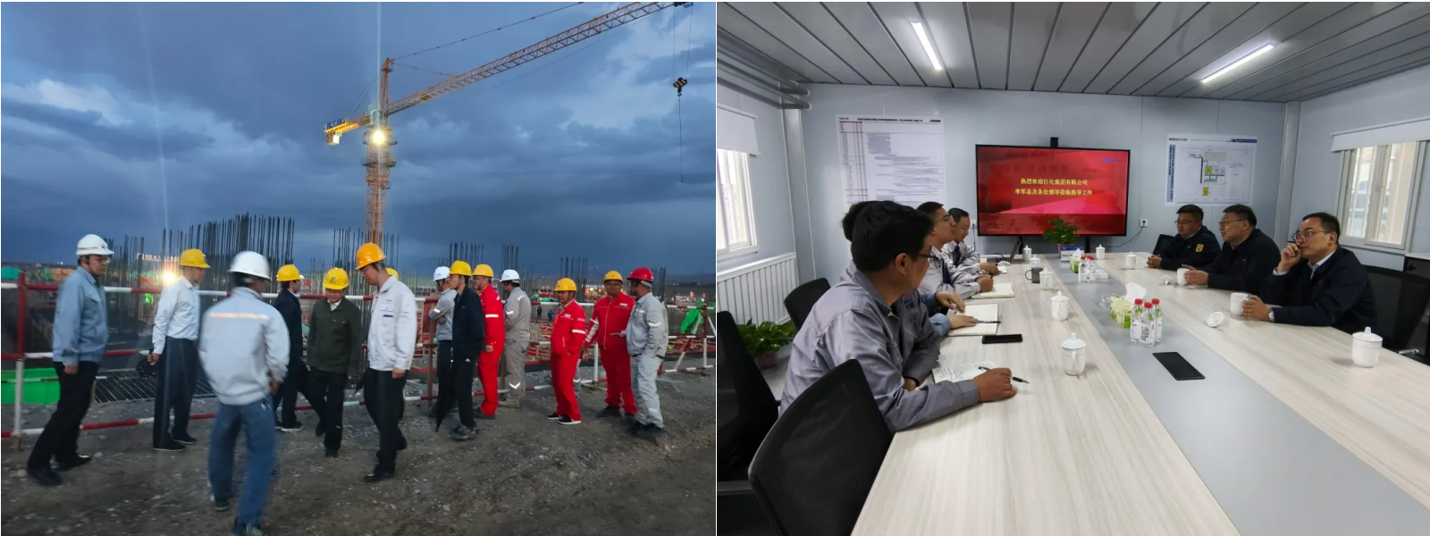 圖丨左:天俱時(shí)項(xiàng)目部及聯(lián)合體成員開工儀式合影;右:項(xiàng)目夜間施工掠影